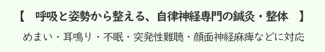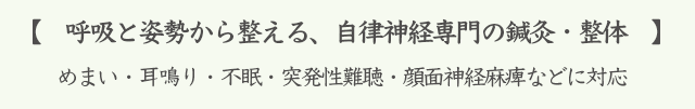 自律神経の不調・突発性難聴・耳鳴り・めまい・頭痛・顔面神経麻痺を得意とし、鍼治療と整体で「症状改善」を目的とした施術を行っています。