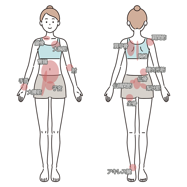 当院では、首や肩のこりを改善するために、手・足・背中・腰のツボを使い、全身のバランスを整えることで持続的な改善を目指しています。