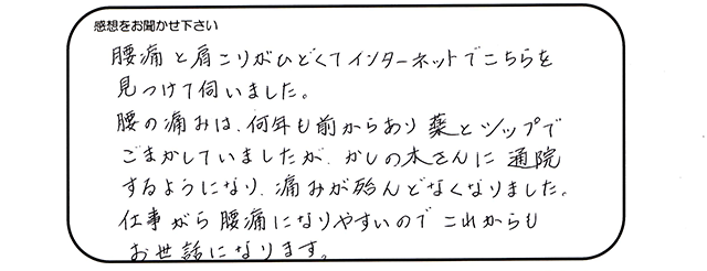 腰痛と肩こりがひどくてインターネットでこちらを見つけて伺いました。